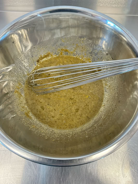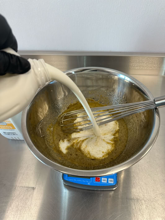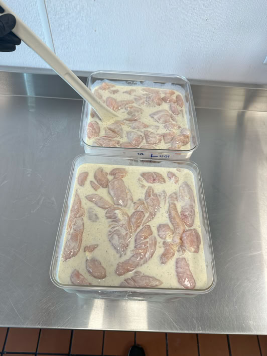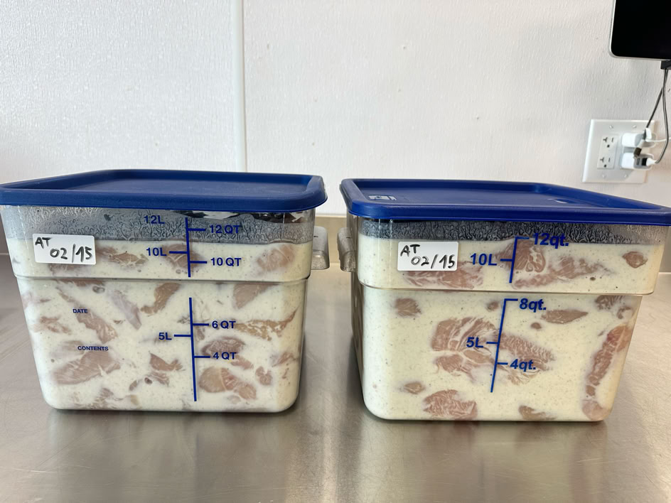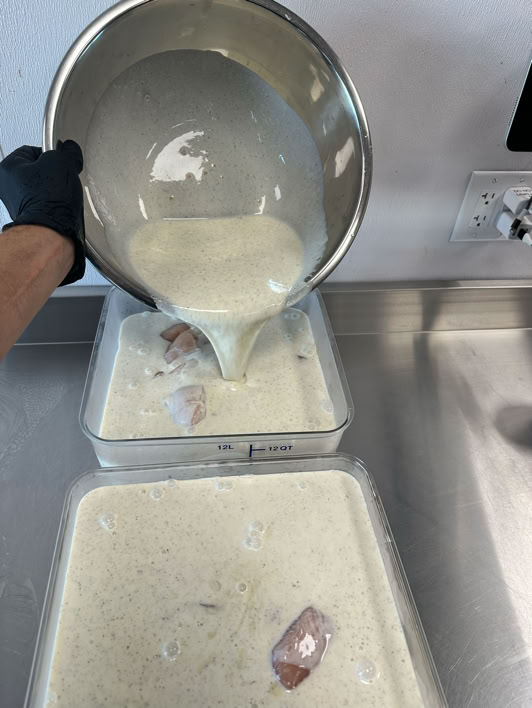 Then slowly add 1 gallon buttermilk while mixing with the whisk. The whole mix is about 4400g. Pour half the marinade is the second stainless steel bowl.