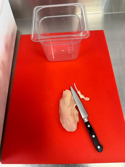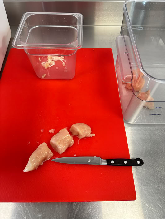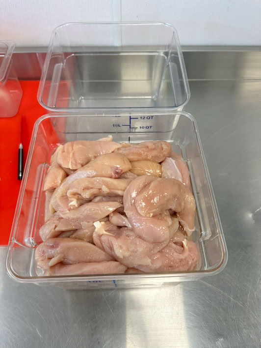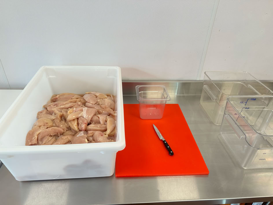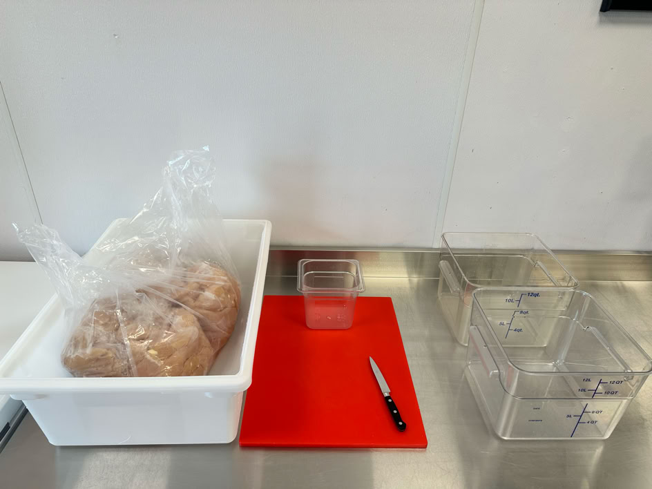 Ingredients & Setup : 1 chicken case (about 172 pcs) in large white plastic bin, cutting board, sharpened knife, 2 12QT containers, 1 small container.