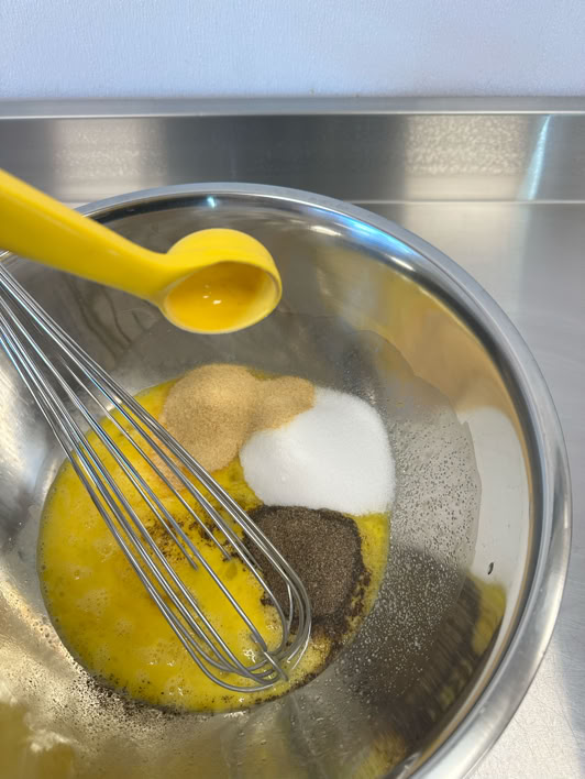 In the large bowl, add the 8 eggs, 1OZ black pepper, 2 OZ garlic powder, 6OZ of salt. Mix well with whisk.